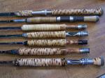 Wow Kevin, very nice. I see what looks like a peacock feather inlay on one rod. Is that a fairly straightforward task?...... I can't say that I've ever read about the techniques/ process of rattan gripwork. Give us the thumbnail version. Very striking results,,,,Jim