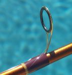 Here's a donation rod I just finished for my son's high school baseball team. This will be one of the silent auction items next month. Batson Rainshadow 8' 8-15 lb. (although it feels more like 10-20 lb) blank painted in a root beer finish. Fuji GLVLG spinning guides and PacBay graphite reel seat matched with a Bass Pro Shops EX4000 spinning reel. Split-grip hardwood handle assembly made with Spalted Maple and Zebrawood with ivory and black inlays (thanks Mark B. for the info and tips) and 6 coats of Tru-Oil. Guide wrap colors, dark brown NCP A and gold NCP A. Trim colors, dark brown nylon A, gold nylon A and tan A. Continuous tiger fade with dark brown NCP A and gold metallic electra A under with dark brown nylon A and gold nylon A overtop and (and of course bear paw prints). Fun project. Randy.