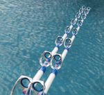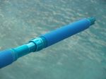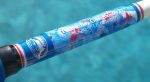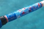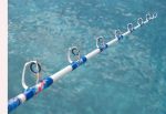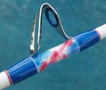 Today I received a beautiful pair of matching stand-up rods from Randy Search (Zombie). These rods are built on Pac Bay 50 lb class blanks with chrome turbo guides with blue inserts, blue reelseat, blue grips and gimbel, Beautiful marbeling at the butt and under the guide wraps, and custom decals. These rods are special and Randy put a lot of work into them. Let's all send him a great big "Thanks, Partner". Can we make him an honorary Texan? Pat