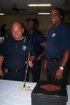 Well on very short notice and some quick emails I ended up picking up a rod from Terry on Monday for a benefit dinner being held for Pct. 6 Harris County Constable Turnage. Officer Turnage was severly injured as he was just getting of his shift as a motorcycle officer here in Harris Co. He was struck by a drunk and is still in the hospital and is expected to be there for some time. I am glad Pat agreed to do this as these are our local guys that look out for our saftey every day. His fellow officers and family were very appreciative of the donation and as the rod was on display today at the dinner a special raffle will be held in hopes of bringing more money. I know the pics are not that great but I got there as they were wrapping up the dinner and had to make it quick. Over 600 plates were sold during lunch!